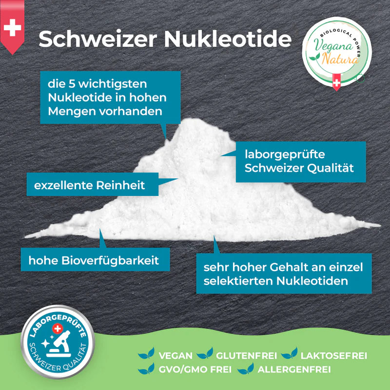 Nukleopure von Vegana Natura ist ein Nahrungsergänzungsmittel mit sehr hohem Gehalt an einzel-selektierten Nukleotiden. Die Mischung aus aufgereinigten Nukleotiden aus einem speziellen Hefeextrakt ist angelehnt an die Natur.